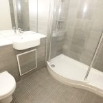 With stylish contemporary three-piece white suite comprising low suite WC and hand wash basin semi recessed into worktop unit with large fitted mirror, large walk-in shower cubicle having thermostatic shower with full height tiled surround. Tiled flooring. Electric ladder radiator in chrome finish. Extractor fan. Automatic light sensor. Low voltage ceiling spotlights.