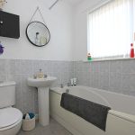 With a three piece white suite comprising low suite wc, pedestal hand wash basin, and a panelled bath having independent shower over. Ceramic wall tiling. Central heating radiator. Loft hatch access. UPVC sealed unit double glazed window incorporating privacy glass.