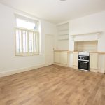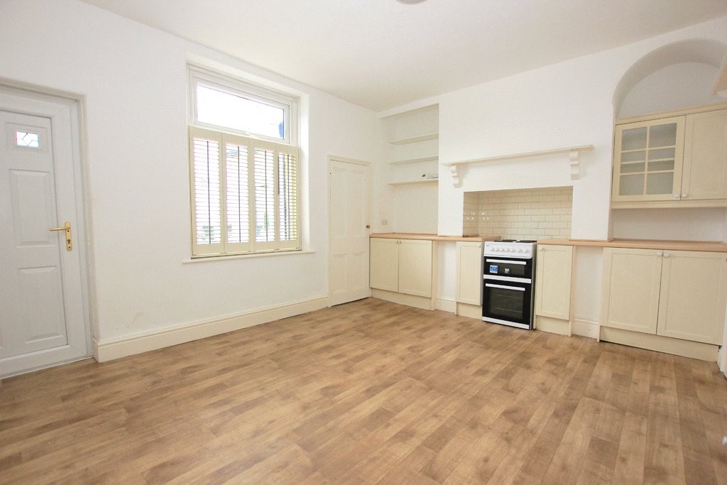 15'6" x 12' with oak effect flooring. Central heating radiator. Sealed unit UPVC rear entrance door and matching window with plantation shutters. Fitted base units with a contrasting pine effect worktop. Beko freestanding oven with a four ring electric hob. Useful understair storage cupboard with fitted shelving.