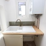 4'6" x 4'2" with a fitted base unit with pine effect worktop and tiled surround. Ceramic one and a half bowl sink and drainer with a brass hot and cold mixer tap. Wall mounted Glowworm gas fired combination boiler.
