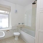 Pedestal wash basin. Panelled bath with a matte black dual thermostatic and rainfall shower with tiled surround. Low suite w/c. Sealed unit UPVC double glazed window. Extractor fan. Central heating radiator. Storage cupboard.