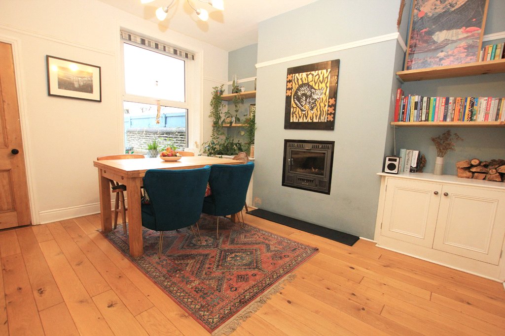 9'10" x 8'10" Appointed with a quality range of painted base and wall units in contemporary light grey whilst providing contrasting granite effect worktop surfaces having complementary 'Metro' tiled surrounds. Stainless steel sink and drainer. Built-in stainless steel finish Whirlpool oven with a matching four ring Stoves gas hob having a Cooke and Lewis extractor hood above in a glass and stainless steel finish chimney style canopy. Integrated freezer. Plumbing for an automatic washing machine or a dishwasher. UPVC sealed unit double glazing. Double central heating radiator. Concealed Ideal gas central heating boiler. Recessed low voltage ceiling spotlights and lighting beneath the wall units. Laminate slate style flooring. Deep built-in store place under stairs. A UPVC and sealed unit double glazed external door gives access to the enclosed stone flagged rear yard.