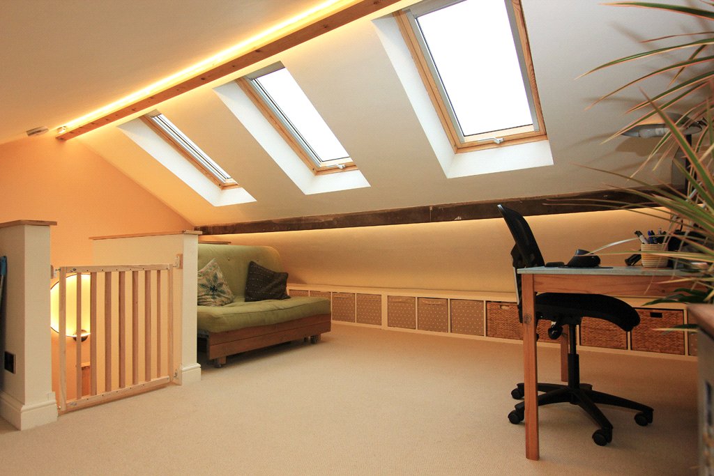 15'5 x 13'3 A superb room offering a great level of versatility. With three velux windows providing plenty of natural light. Feature exposed wooden beams and chimney brickwork. LED lighting. Central heating radiator. Brushed chrome powerpoints. High quality fitted carpets.