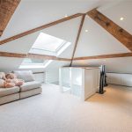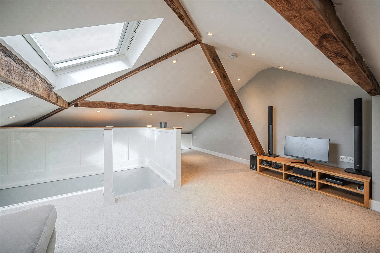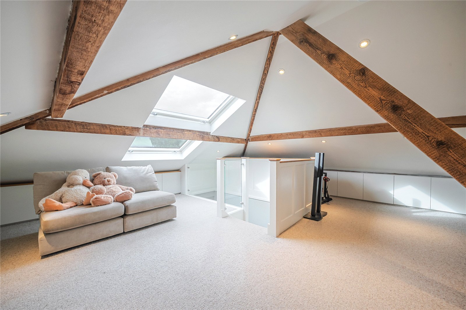 19'6" x 16'9" (with some reduced head height) with velux windows having superb long distance views. Storage base units. Recessed low voltage ceiling spotlights. Glass balustrade. Exposed beams and trusses.