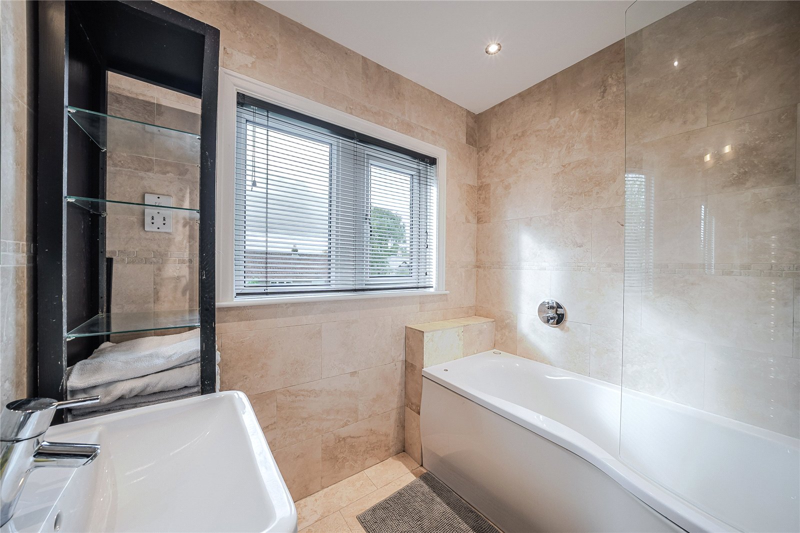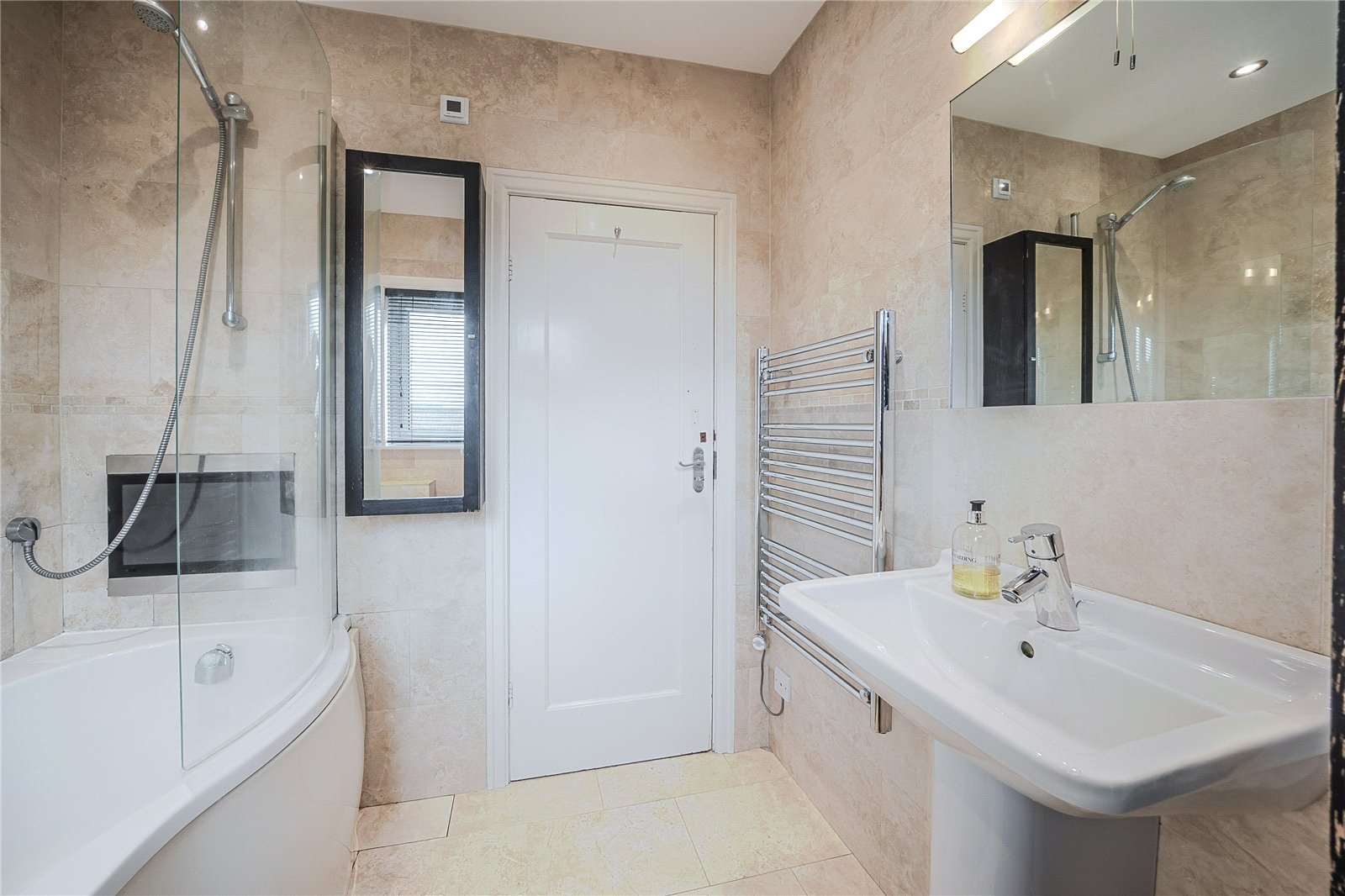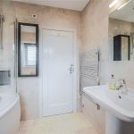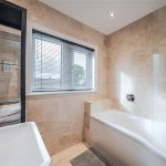 Full wall and floor tiling with electric underfloor heating. Panelled jacuzzi bath with a chrome thermostatic shower over. Ceramic wash basin with mirror over with fitted Demista Pad. Chrome heated towel rail. Extractor fan. Sealed unit UPVC double glazed window. Recessed low voltage ceiling spotlights. Medicine cabinet.