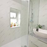 Superbly appointed three-piece white suite comprising low suite w/c, hand wash basin, and large walk-in shower enclosure housing dual head thermostatic shower. UPVC sealed unit double glazing. Contemporary marble effect mermaid boarding.