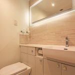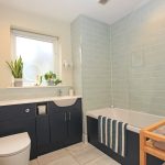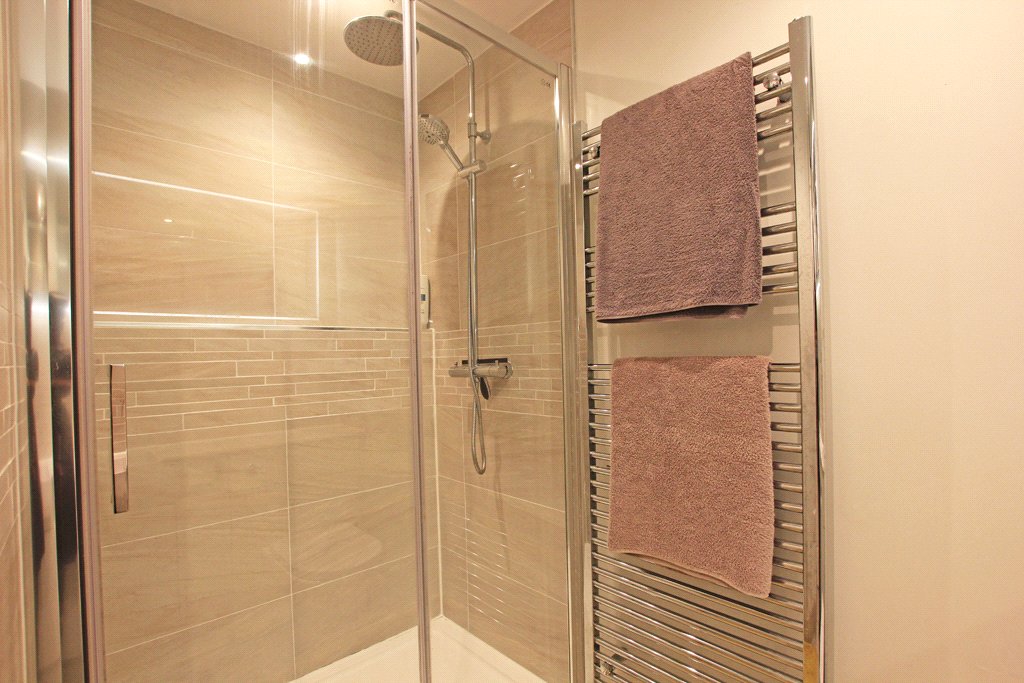 Tiled floor with electric underfloor heating. Contrasting partial wall tiling. Fitted towel radiator. Recessed low voltage ceiling spotlights. Extractor fan. Panelled bath with a chrome thermostatic shower. Hardwood sealed unit double glazed window. Ceramic wash basin built into a unit with storage underneath and a concealed cistern w/c. LED touch mirror over.