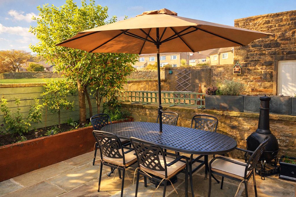 To the rear there is an enclosed Westerly facing stoned paved patio with well-stocked flower and shrub raised beds. There is also a timber shed.