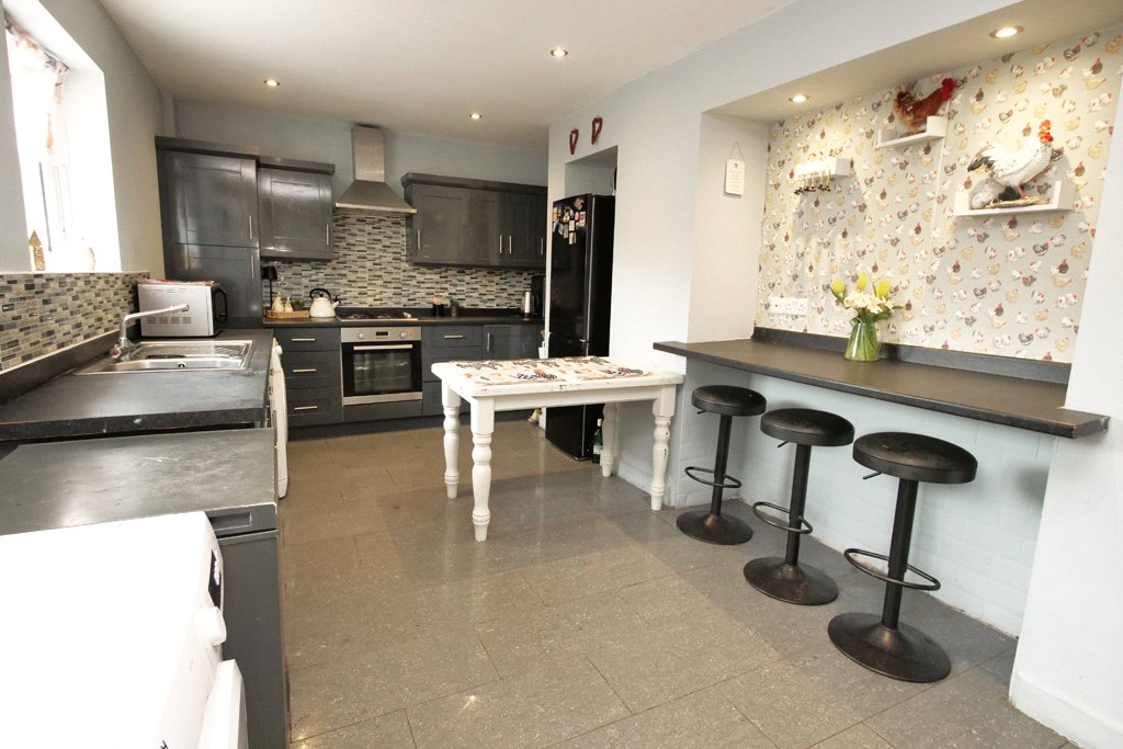 21'2" x 10'2" (both maximum) Well appointed with a range of two-tone gloss fronted fitted wall and base units incorporating complementary granite effect worktop surfaces. One and a half bowl stainless steel sink and drainer unit. Built-in electric oven. Four ring gas hob with stainless steel extractor canopy over. Breakfast bar area. Central heating radiator. Plumbing for an automatic washing machine. UPVC sealed unit double glazed patio doors leading to the rear garden together with matching window. Recessed ceiling spotlights. Concealed wall mounted I-Mini gas central heating combination boiler.