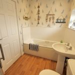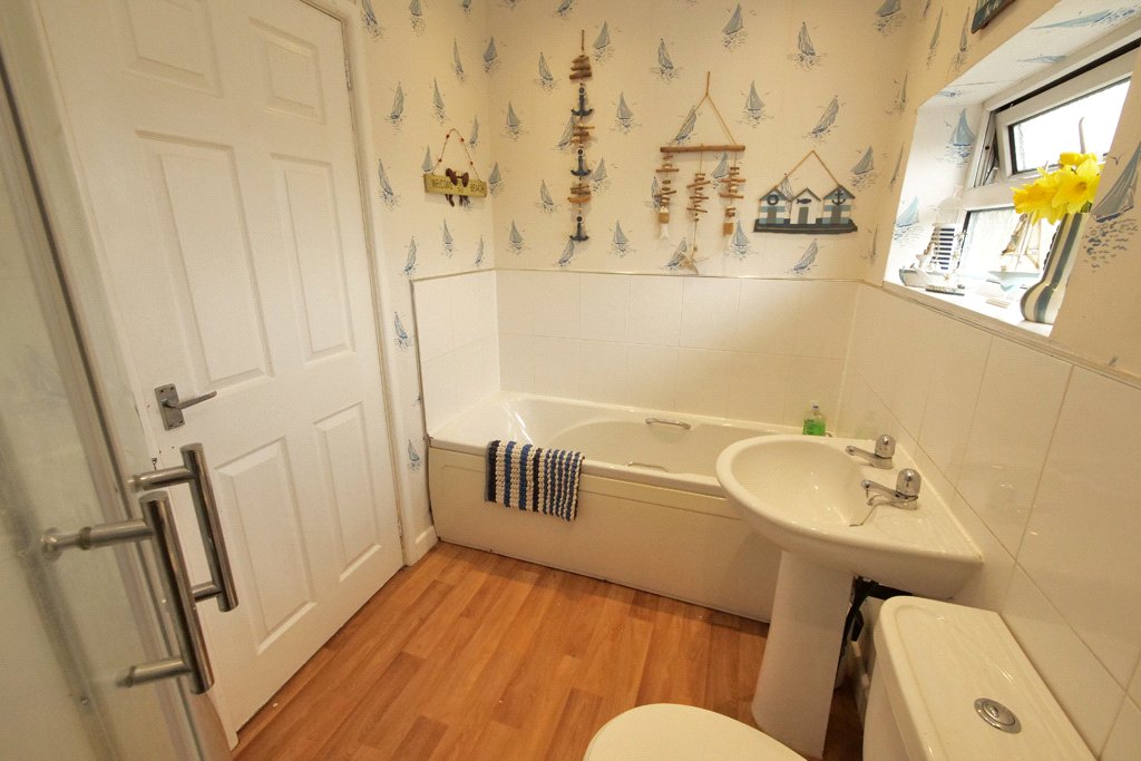 Equipped with a modern white four piece suite comprising low suite WC, pedestal hand wash basin, a panelled bath and a separate corner shower enclosure housing a stylish multi-jet mixer shower. UPVC sealed unit double glazed window. Recessed ceiling spotlights. Extractor fan. Towel radiator.