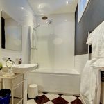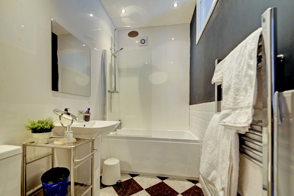 Well-appointed three-piece white suite comprising low suite w/c, pedestal hand wash basin and fitted bath with dual head thermostatic shower and glass shower screen. Chrome central heating towel radiator. Built in linen cupboard. Recessed ceiling spotlights. Extractor fan. Tile effect flooring.
