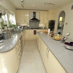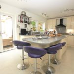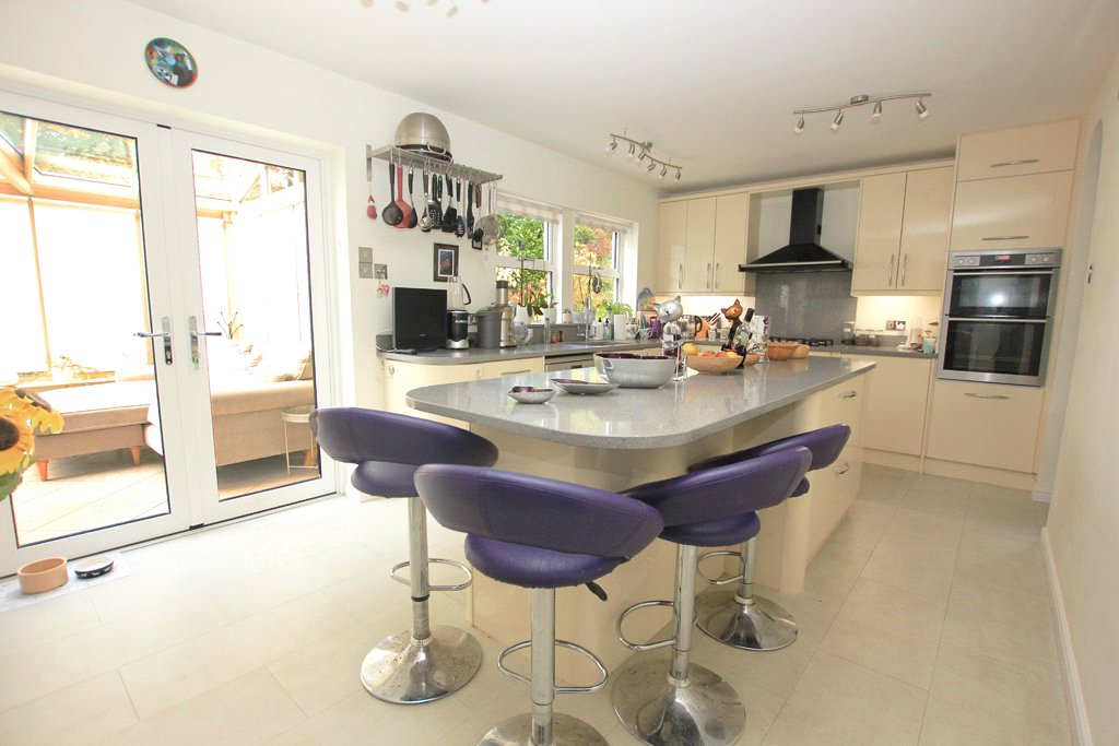17'8" x 10'4" Superbly appointed with a quality range of stylish contemporary cream gloss fronted units including contrasting quartz worktop surfaces having matching up-stands and also a matching island unit with a recess for seating on two sides to provide a breakfast bar. Built-in AEG split level double oven with a matching AEG five ring gas-on-glass hob having a quartz backing plate and a Rangemaster extractor hood above in a canopy. Plumbing for a dishwasher. Sink and drainer. Fitted ceiling spotlights. White aluminium sealed unit double glazing and there are also twin French doors to the spacious sun room.