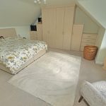 With a quality contemporary white suite comprising a hand wash basin recessed into a worktop with cabinets beneath and a mosaic tiled surround together with a low suite WC and also a shower cubicle which incorporates mermaid wall panelling, a hand-held shower and an overhead rainfall shower. Mosaic wall tiling. Velux window. Central heating radiator. Shaver point. Extractor fan. Tiled flooring. Under floor heating. Fitted medicine cabinet. Fitted ceiling spotlights.