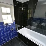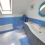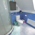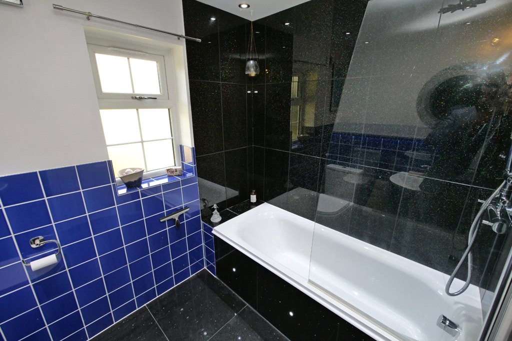 With a quality contemporary white suite comprising a built-in bath having a screen, a hand-held shower and an overhead rainfall shower together with a pedestal wash basin and a low suite WC. Contrasting wall tiling and also tiled flooring. UPVC sealed unit double glazing. Ladder central heating radiator in anthracite finish. Shaver point. Under floor heating. Extractor fan. Recessed ceiling spotlights.