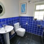 With a quality two piece white suite comprising a low suite WC and a circular hand wash basin which stands on a mosaic tiled worktop with a pillar tap and a tiled splash-back. UPVC sealed unit double glazing. Column central heating radiator in chrome finish.