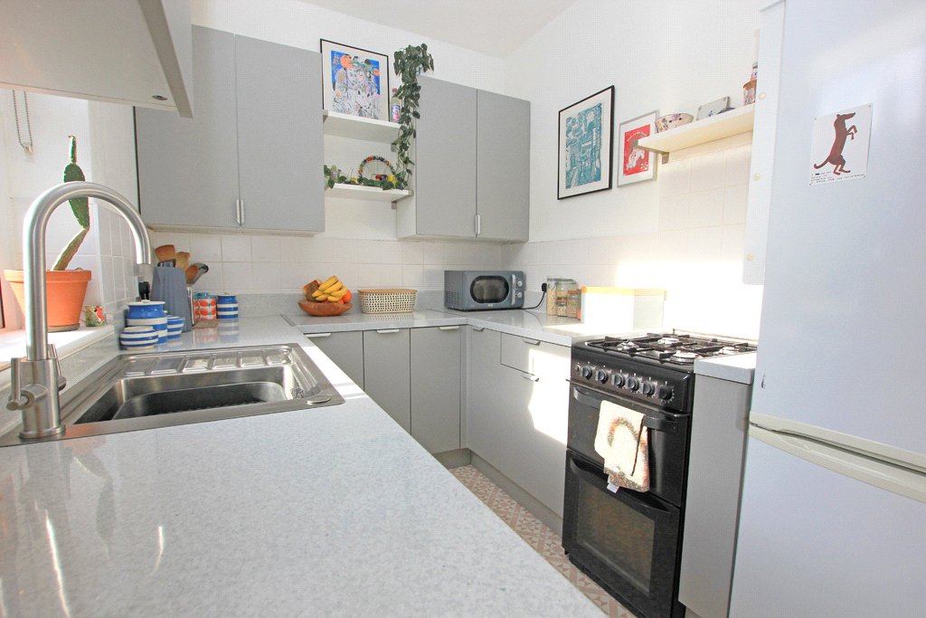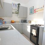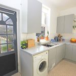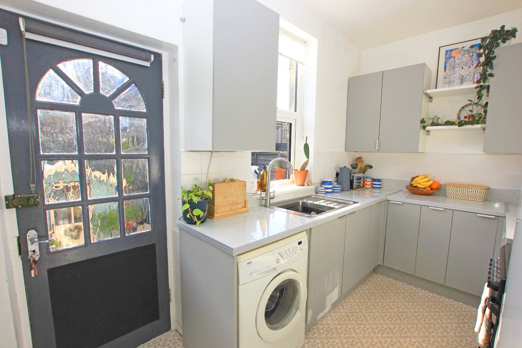 12’3 X 6’9 Appointed with an attractive range of fitted base and wall units having matt fronts with contrasting laminated worktop surfaces. Ceramic wall tiles. Stainless steel sink with drainer unit. Free standing oven. Central heating radiator. Gas central heating boiler. Plumbing for automatic washing machine and vent for dryer. Vinyl flooring. Partly multi-paned Regency style timber rear entrance door.