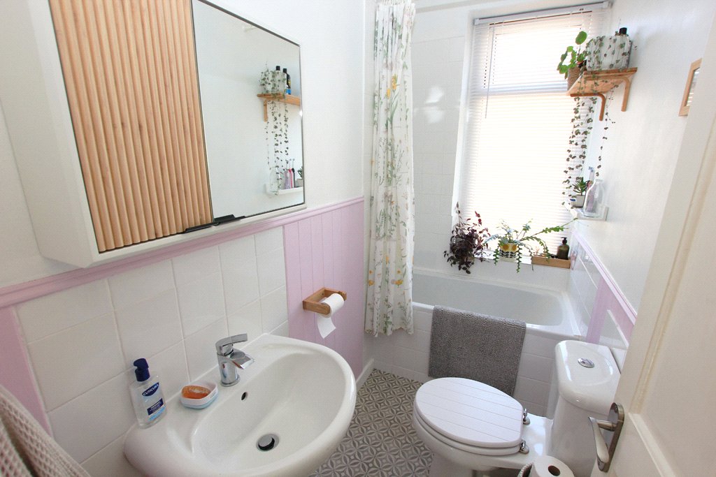 With three piece white suite comprising panelled bath including Triton independent shower together with pedestal wash basin having tiled splashback and low suite WC. Neutral wall tiling around the bath and shower. UPVC sealed unit double glazing. Vinyl flooring.