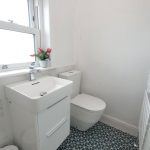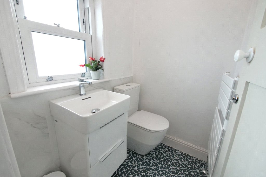 Superbly appointed with a modern suite comprising low suite WC together with a hand wash basin set on a vanity cupboard. Towel radiator. UPVC sealed unit double glazed window. Geometric pattern floor tiling. Extractor fan. Partial ceramic wall tiling.