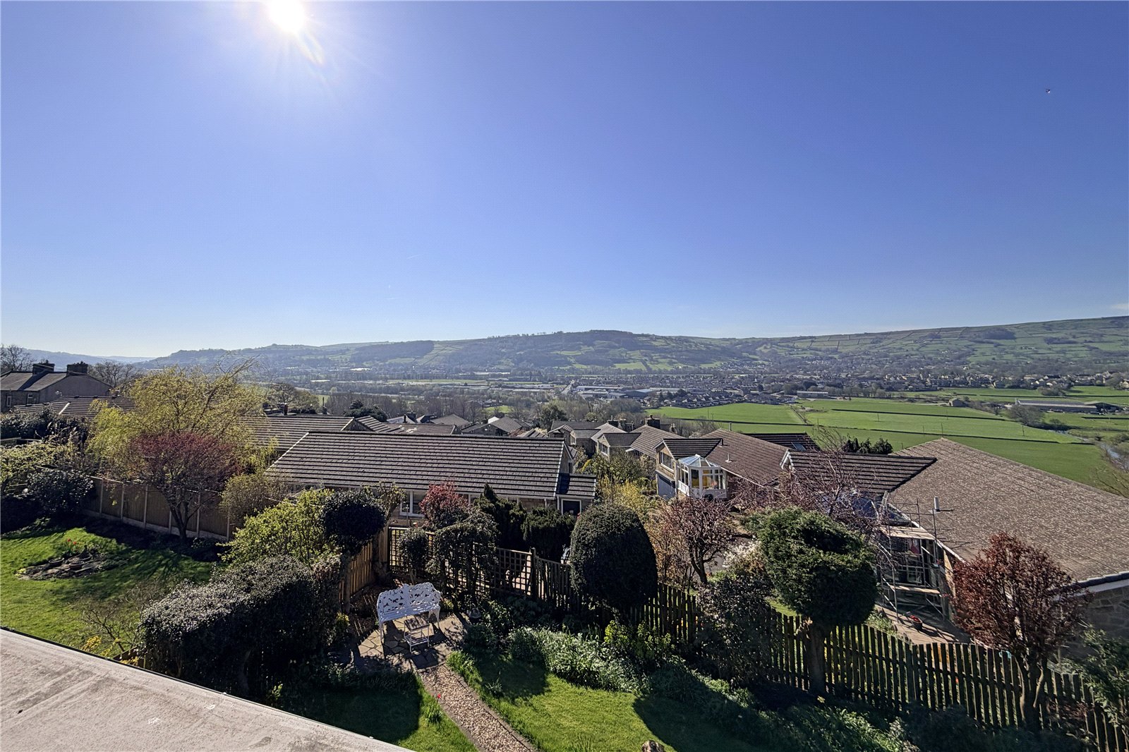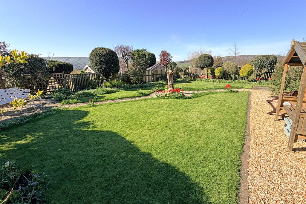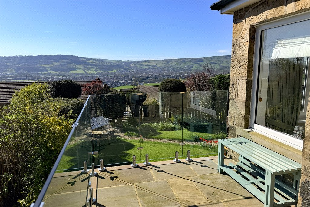 At the rear there is an impressive fully enclosed landscaped garden enjoying an ideal southerly aspect and with long distance views across the valley. The garden has been well designed including a predominantly level lawn area with attractive well stocked flower beds, stone flagged patio area and two raised sun terraces with glass balustrades making the most of the long-distance views, also including garden storage underneath.