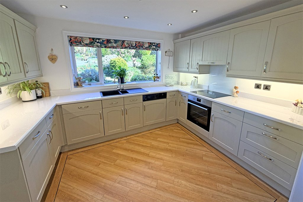 12’05” x 8’08” Well appointed range of wall and base units incorporating granite effect worktop surfaces having matching upstands. One and half bowl sink and drainer unit. Built in AEG electric oven. AEG four ring induction hob with extractor over. Integrated dishwasher. Integrated fridge. Integrated freezer. UPVC sealed unit double glazing. Central heating radiator. Wood effect Amtico flooring. Open through to: