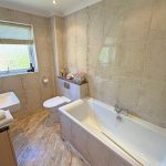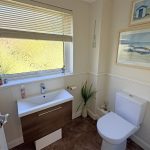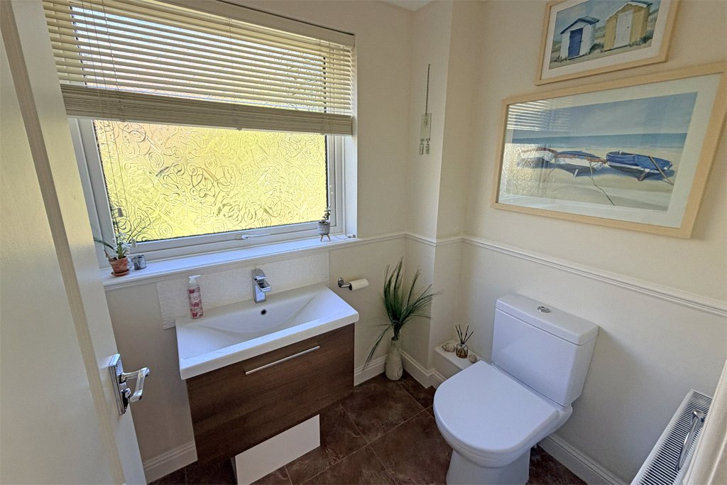 Well-appointed two-piece white suite comprising low suite w/c and hand wash basin set on vanity cabinet. UPVC sealed unit double glazing. Central heating radiator. Tiled floor.