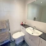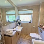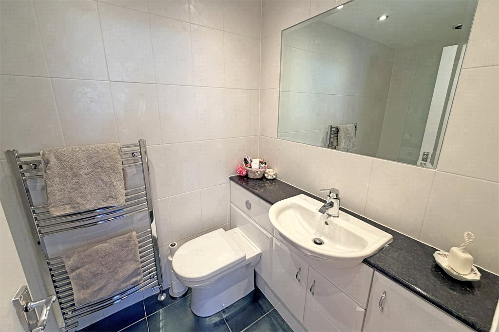 Superbly appointed three-piece white suite comprising low suite w/c and hand wash basin set on vanity cabinet, fitted tiled bath with thermostatic shower and glass shower screen. UPVC sealed unit double glazing. Recessed ceiling spotlights. Amtico wood effect flooring. Ladder central heating chrome radiator. Extractor fan.