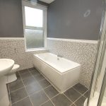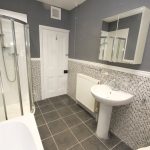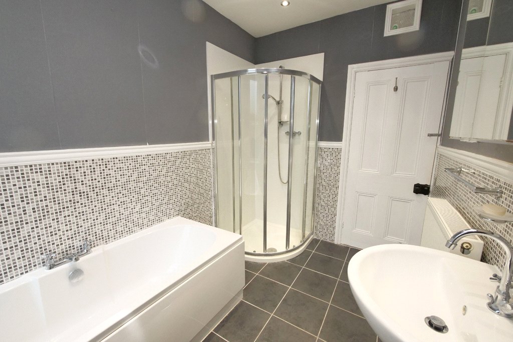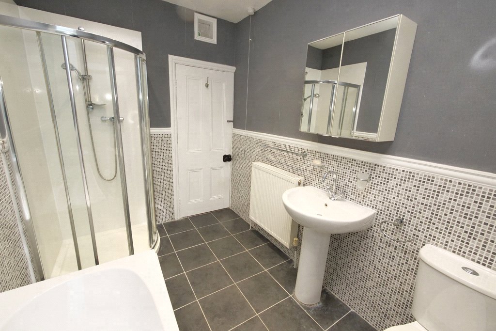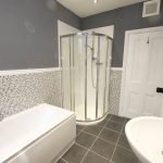With a quality contemporary four piece white suite comprising built-in oval bath, pedestal wash basin, low suite WC and shower cubicle incorporating a thermostatic shower. Contrasting mosaic style wall tiling. Slate tiled flooring. UPVC sealed unit double glazing. Double central heating radiator. Recessed ceiling spotlights.