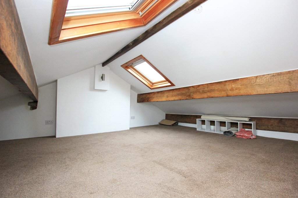 13'6" (maximum including stairwell) x 8'4" (plus eaves recesses) With two velux windows. Long distance views at the rear and towards the moors. Exposed beams. Two fitted wall lights. The attic space is accessed via an alternating tread staircase from the first floor landing.