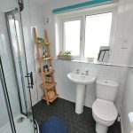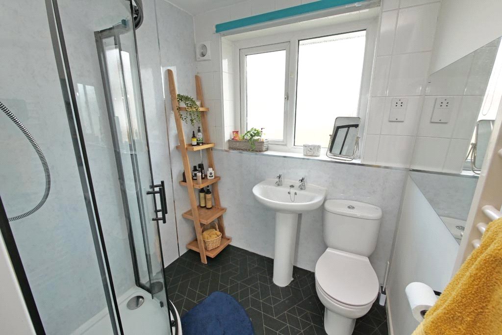 With a three piece white suite comprising a pedestal wash basin, a low suite WC and a shower cubicle incorporating a thermostatic shower. Contrasting mermaid wall panelling and partial wall tiling. UPVC sealed unit double glazing. Ladder central heating radiator. Shaver point. Extractor fan. Built-in store/linen cupboard.