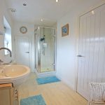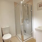 With a three piece white suite comprising a tiled shower cubicle having a thermostatic shower together with a low suite WC and a hand wash basin which is semi-recessed into a cabinet unit with a tiled splash-back. Tiled flooring. UPVC sealed unit double glazing. Central heating radiator. Extractor fan. Recessed ceiling spotlights.
