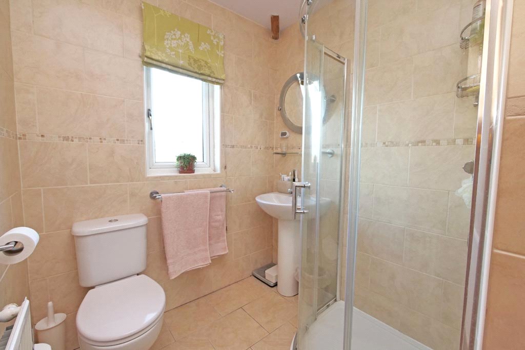 Well-appointed three-piece white suite comprising low suite w/c, pedestal hand wash basin and walk in shower enclosure housing thermostatic shower. Full height wall tiling and floor tiles. UPVC sealed unit double glazing. Central heating radiator. Built in linen cupboard.