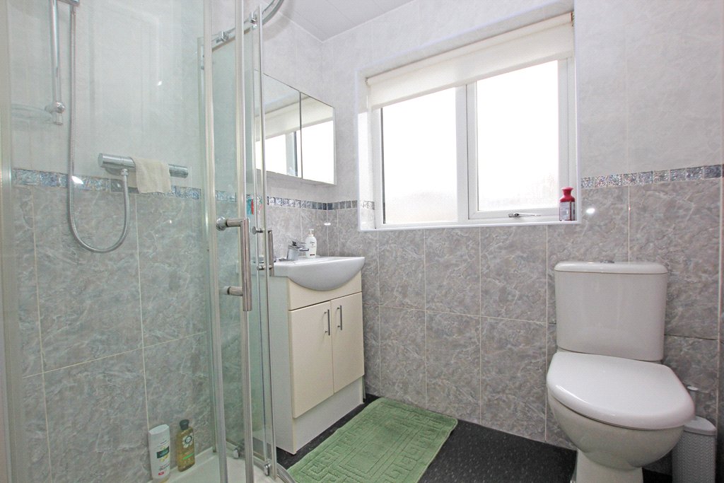 Full wall tiling. Vanity wash basin with storage underneath and a mirrored medicine cabinet over. Sealed unit UPVC double glazed window. Recessed low voltage ceiling spotlights. Low suite w/c. Chrome heated towel rail. Shower cubicle with a chrome thermostatic shower.