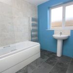 With a three piece white suite comprising a pedestal wash basin, a low suite WC and a panelled bath including a glass screen, contemporary wall tiles and a shower to the mixer tap. UPVC sealed unit double glazing. Ladder central heating radiator in chrome finish. Slate style tiled flooring. Recessed low voltage ceiling spotlights.