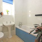 Pedestal wash basin. Low suite w/c. Panelled bath with chrome bath taps and a shower head attachment. Partial wall tiling. Sealed unit UPVC double glazed window. Extractor fan. Central heating radiator.