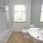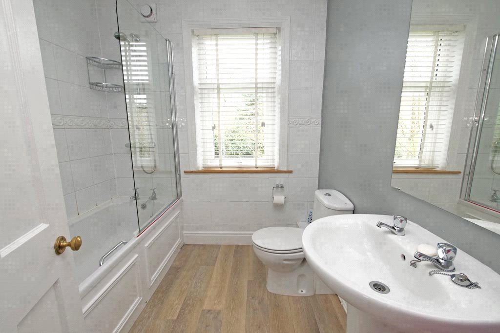 Well-appointed three-piece white suite comprising fitted bath including a thermostatic shower and glass shower screen, low suite w/c, and pedestal hand wash basin. UPVC sealed unit double glazing. Ladder central heating towel radiator. Extractor fan. Wood effect flooring. Partial ceramic wall tiles.