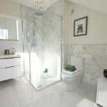 High quality contemporary bathrooms featuring walk in showers with rain heads, wall hung basin vanity units with LED mirror cabinets and easy clean water saving rimless toilets.