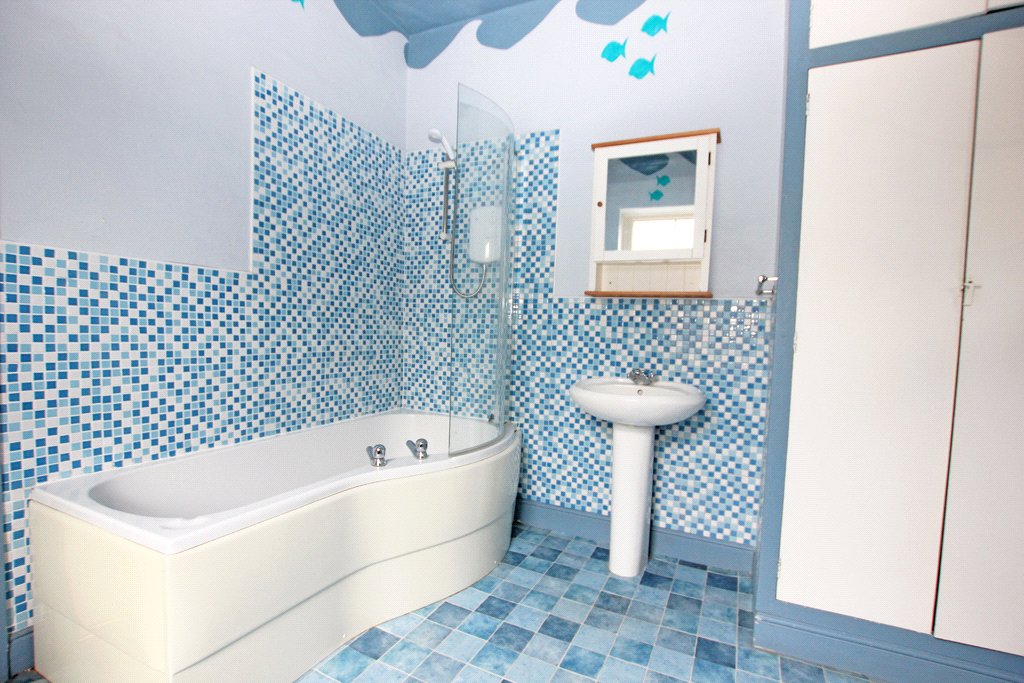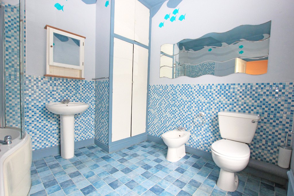 Low suite w/c. Bidet. Panelled bath with a Triton electric shower over. Pedestal wash basin. Central heating radiator. Sealed unit UPVC double glazed window. Partial wall tiling. Useful storage cupboard.