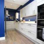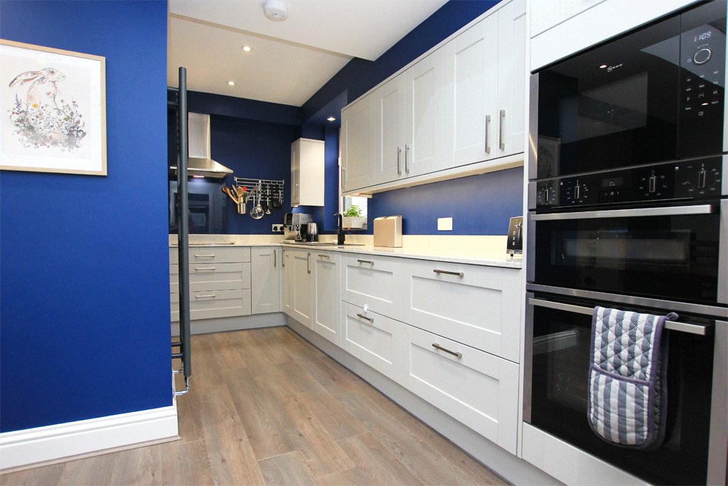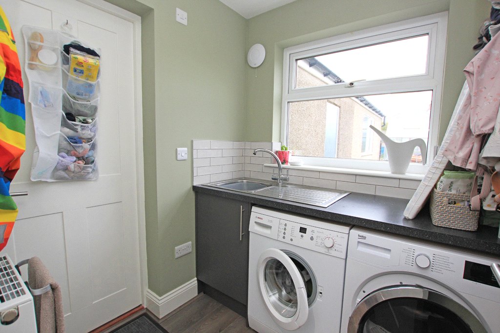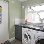 UPVC sealed unit double glazed window. Recessed LED ceiling spotlights. Floorspace and plumbing for an automatic washing machine and dryer. One cupboard and contrasting laminated worktop surface. Stainless steel sink and matching drainer. Central heating radiator. Pedestrian door to the adjoining garage.