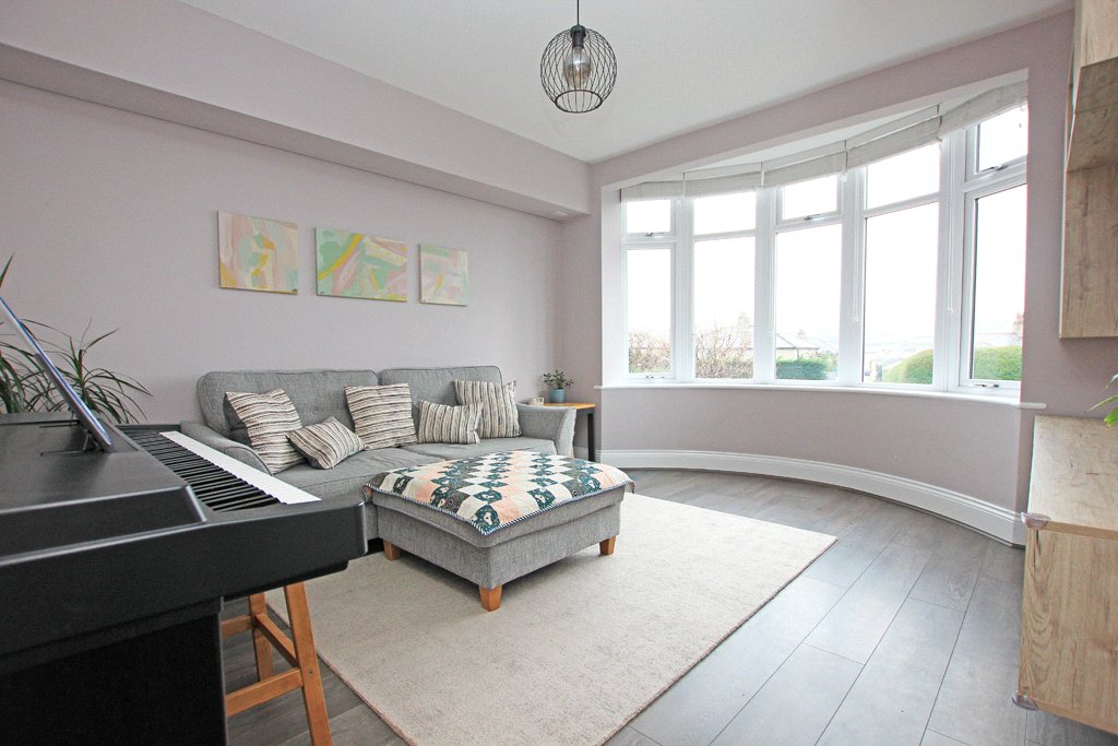 14’5 X 11’9 UPVC sealed unit double glazed semi-circular bow window providing superb long distance southerly views at the front across the valley towards the moors and countryside. Central heating radiator. Picture rails. Fitted carpets.