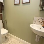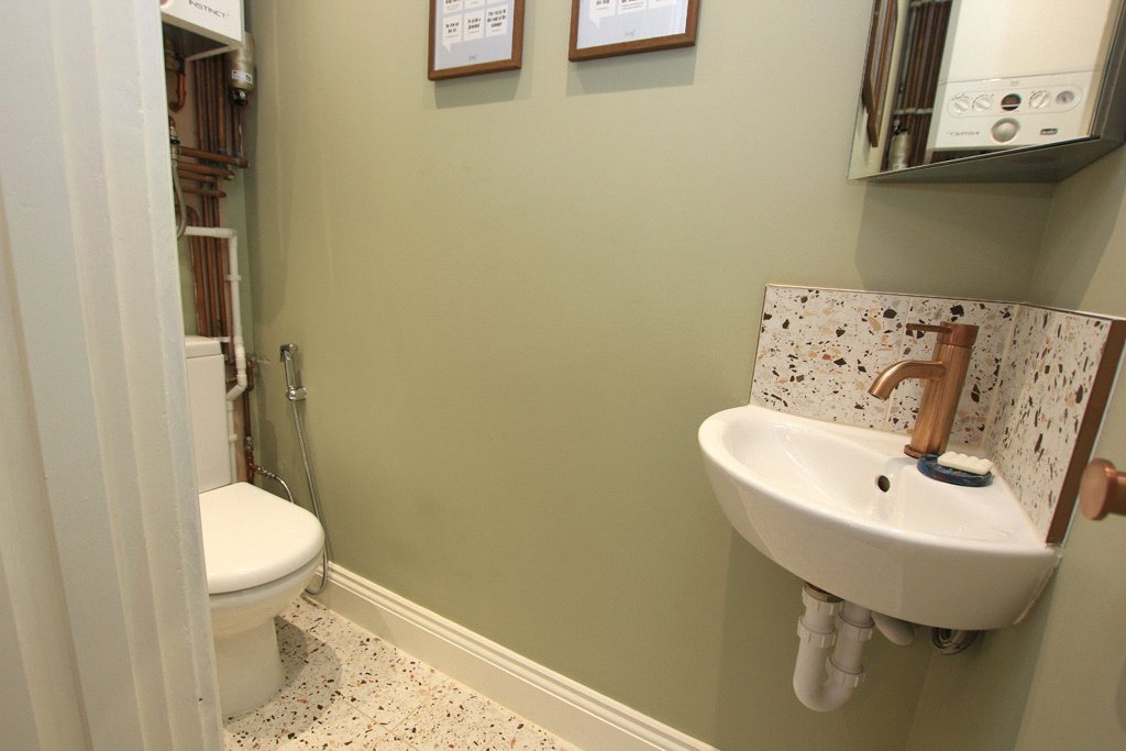 With a two piece white suite including low suite wc, and a small corner hand wash basin with stylish copper mixer tap. Decorative ceramic floor tiling. Wall mounted Ideal gas combination boiler. UPVC sealed unit double glazed window incorporating privacy glass.