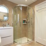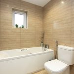 With a modern four piece white suite comprising a panelled bath, a low suite WC and a hand wash basin semi-recessed into a vanity cupboard unit together with a shower enclosure incorporating a thermostatic shower. Contrasting full height ceramic wall tiling. UPVC sealed unit double glazing incorporating privacy glass. Ladder central heating radiator in chrome finish. Recessed low voltage ceiling spotlights.