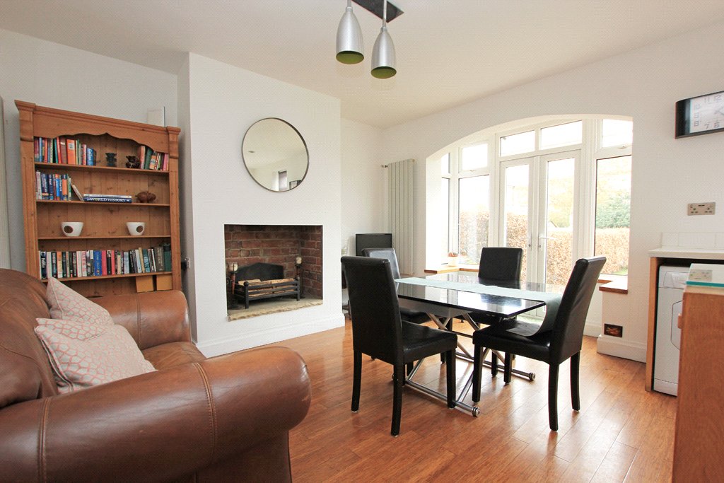 The dining room includes a UPVC sealed unit double glazed square bay window with twin French doors to the attractive rear garden. Two vertical central heating radiators. Raised fireplace recess with a brick interior and a stone flag hearth. Bamboo wood flooring. Open through to the: