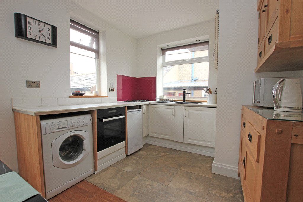 The kitchen includes fitted base and wall units together with worktop surfaces. One and a half bowl composite sink and drainer with a pillar tap. Built-in oven and a four ring gas hob. Plumbing for an automatic washing machine. Ladder central heating radiator. Tiled flooring. UPVC sealed unit double glazing to two sides. Recessed ceiling spotlights.
