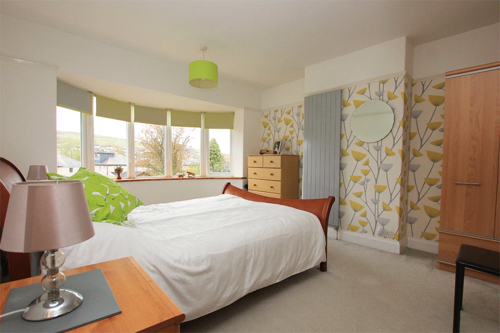 15'5" (into bay) x 12' With a semi-circular UPVC sealed unit double glazed bow window providing superb long distance views across the valley towards the moors. Vertical central heating radiator. Picture rails.