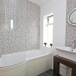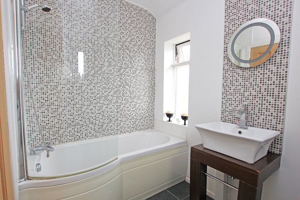 With a three piece white suite comprising a shower bath having a shower to a mixer tap, a curved screen and a full height tiled surround together with a low suite WC and also a hand wash basin which stands on a table unit with a towel rail and a mosaic tiled splash-back. UPVC sealed unit double glazing to two sides. Ladder central heating radiator in chrome finish. Slate tiled flooring. Recessed ceiling spotlight and fitted wall lights.