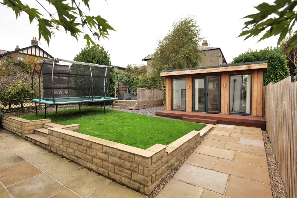To the rear the property features a superb, fully heated and insulated modern detached garden office that would serve a variety of uses being ideal for anyone working or running a business from home. Providing a high level of space, light and comfort including full height feature windows overlooking the garden, this excellent addition to the property offers a significant level of versatility with the potential to be used as a home gym, yoga studio, a workshop/hobby space or perhaps an exciting games/play room adjoining the attractive outdoor space at the rear. The rear garden has been thoughtfully designed with outdoor entertaining in mind, including a superb raised corner decking area together with ample space for children's play equipment. On a sunny day, within only a few moments the high performance five-leaf bi-folding doors can be fully retracted to create a fabulous outdoor-indoor living and entertaining space, ideal for summer parties or larger family gatherings.