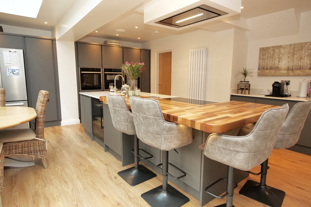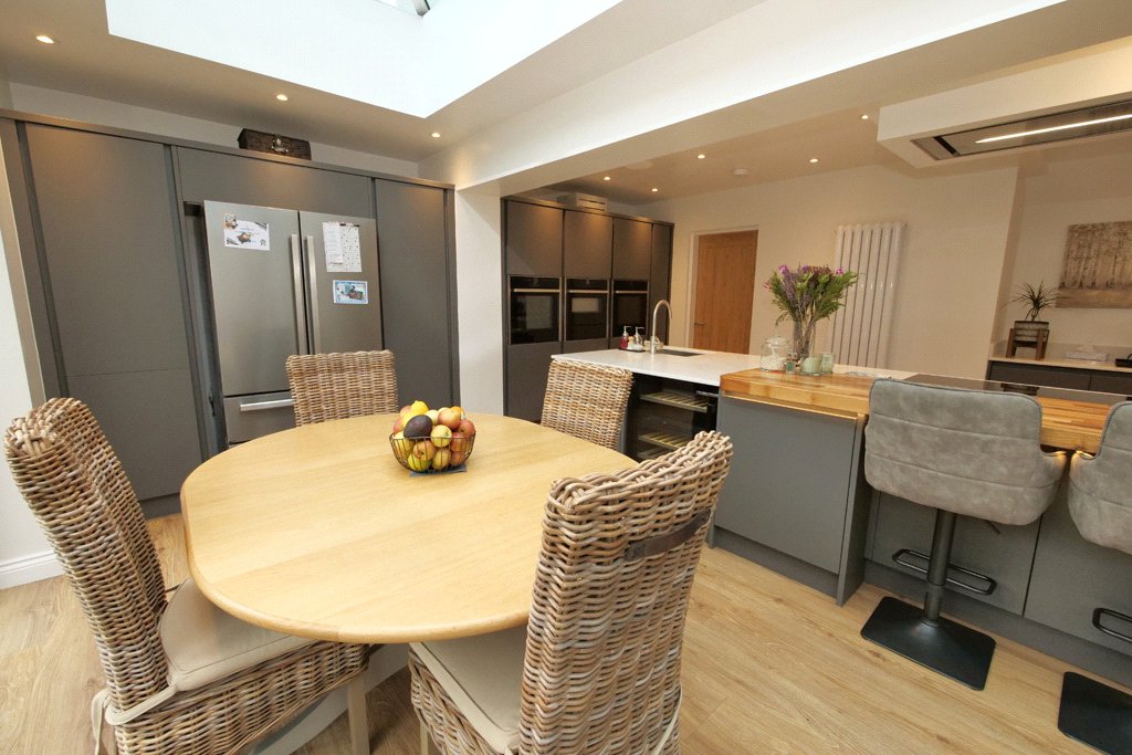The beautifully extended property certainly represents an exciting opportunity, standing in a slightly elevated position at the foot of Raikeswood Drive commanding fine long distance views across the Aire Valley from the first floor whilst including delightful gardens with lawns and feature decking areas also providing a very appealing feature. Internally the spacious accommodation has been imaginatively updated and reconfigured to meet the needs of modern family living including a well equipped utility room and ground floor WC, a welcoming front entrance porch and hallway and well proportioned living room with bay window and gas fire. The spectacular open plan living/dining kitchen extension incorporates an excellent range of stylish and contemporary fitted units including a comprehensive range of integrated appliances, luxurious white quartz and solid oak worktop surfaces and a thoughtfully designed snug/living area adjoining. This wonderful open plan space is flooded by natural light via the huge lantern style roof light above together with two sets of bi-folding doors, further enhancing the sense of light and space whilst offering delightful views over the garden. The state-of-the-art kitchen is equipped with a sophisticated 'Lutron' lighting system together with integrated Sonos speakers to the ceiling. The excellent range of built-in appliances include twin multi-function ovens, a matching microwave, a warming drawer, an induction hob with discreet extractor over, a dual zone wine refrigerator, an integrated dishwasher, an instant boiling water tap and a large American style fridge freezer with cold water plumbing.