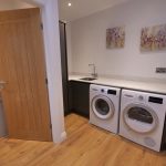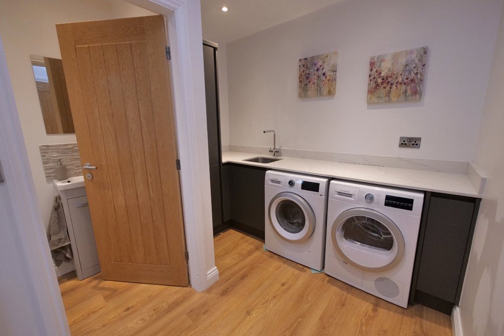 10'1" x 8'8" (both maximum including WC) Superbly appointed with a range of fitted units to match the kitchen together with white quartz worktop surfaces. Plumbing for an automatic washing machine. Space for a dryer. Recessed sink. Recessed ceiling spotlights. Central heating radiator. Oak effect LVT flooring. UPVC sealed unit double glazed side entrance door. Extractor fan. Door leading to: