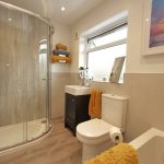 Superbly appointed with a contemporary white suite comprising low suite WC with concealed cistern, hand wash basin mounted into a full width granite effect vanity shelf with recessed mirror over and a shower enclosure incorporating a chrome mixer shower. Partial ceramic wall tiling. Grey oak effect LVT flooring. Recessed ceiling spotlights. Deep built-in linen/store cupboard. UPVC sealed unit double glazed window. Chrome towel radiator. Extractor fan.