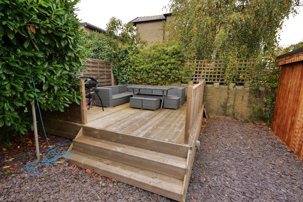 There is paved access at the side leading to the rear garden which offers a delightful outdoor space incorporating a lawn together with Indian stone flagged pathway/patio, a slate bed and a superb raised corner decking area. External power. External lighting. External cold water tap to the side of the property. The rear garden also features a: